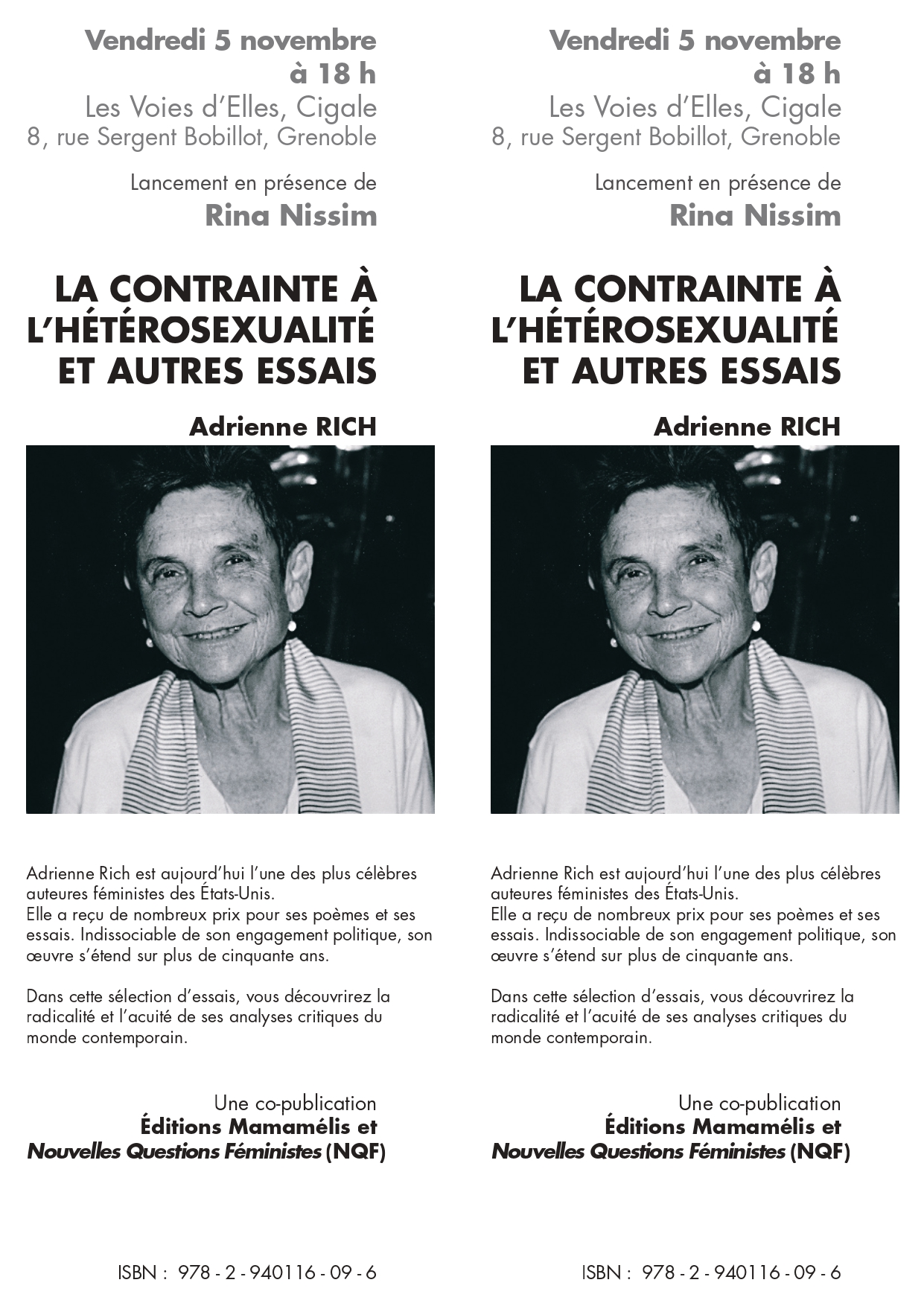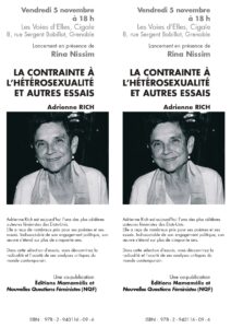 Dans son essai sans doute le plus célèbre – « La contrainte à l’hétérosexualité et l’existence lesbienne » – Adrienne Rich renverse les perspectives habituelles : au lieu de voir l’existence lesbienne comme marginale et déviante, elle choisit de problématiser l’hétérosexualité comme quelque chose qui ne va pas de soi. Dans cette remise en cause des évidences naturalistes patriarcales, elle se demande comment les femmes sont contraintes aux normes hétérosexuelles, et comment l’institution politique de l’hétérosexualité féminine, clef du maintien de la suprématie masculine, se perpétue. Une des originalités d’Adrienne Rich a été aussi d’avoir développé dans ce texte le concept de « continuum lesbien ». Elle nous fait réfléchir à la situation que les femmes auraient, si leurs désirs étaient libérés de la contrainte à l’hétérosexualité et à la procréation. Cet essai avait déjà été traduit par Christine Delphy et Emmanuèle de Lesseps et fut publié en 1981 dans le premier numéro des Nouvelles Questions Féministes. Depuis 1981, aucun texte d’Adrienne Rich n’avait été traduit et publié en français.