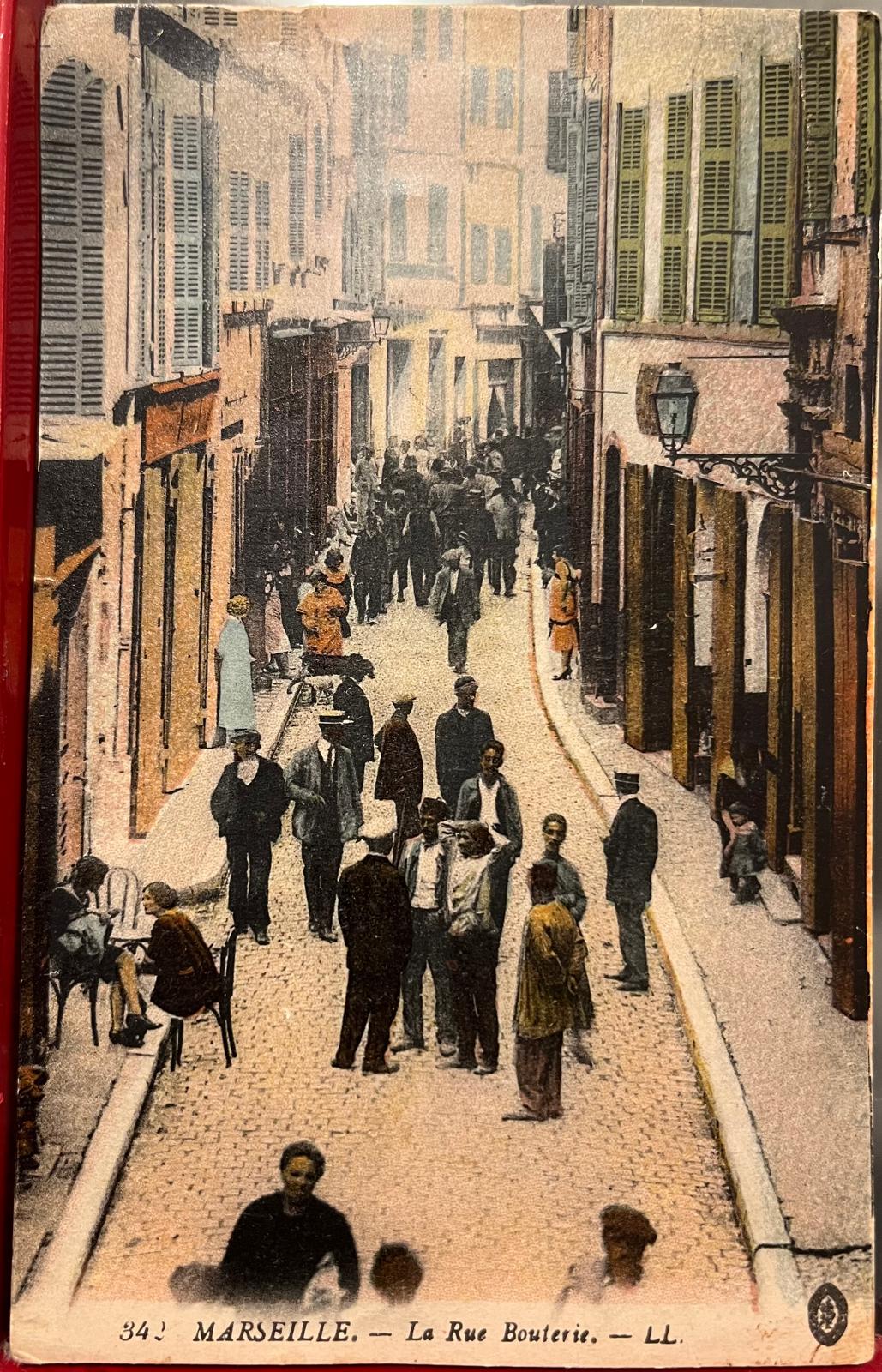 En 1926, Jean Genet 16 ans, s’y rend lors d’une fugue et s’y prostitue plusieurs jours durant et rencontre des prostitués de son âge (15-20 voyous) rue Bouterie et cour Belsunce, il parle de « ville chère aux pédés » ; en 1932 il reviendra et s’éprendra d’un flic ripou, l’inspecteur Bernardini, qui maque des filles à Belsunce et fréquente les gangsters du quartier de l’Opéra ; en 1934 il loge dans un taudis rue Bouterie avec 5 autres garçons, il attirent les pédés en maraude pour les dépouiller, les putains lui achète les objets volés ; en 1943 après 13 condamnations il sera sauvé par l’intervention de Cocteau qui parle du « plus grand écrivain de l’époque moderne »