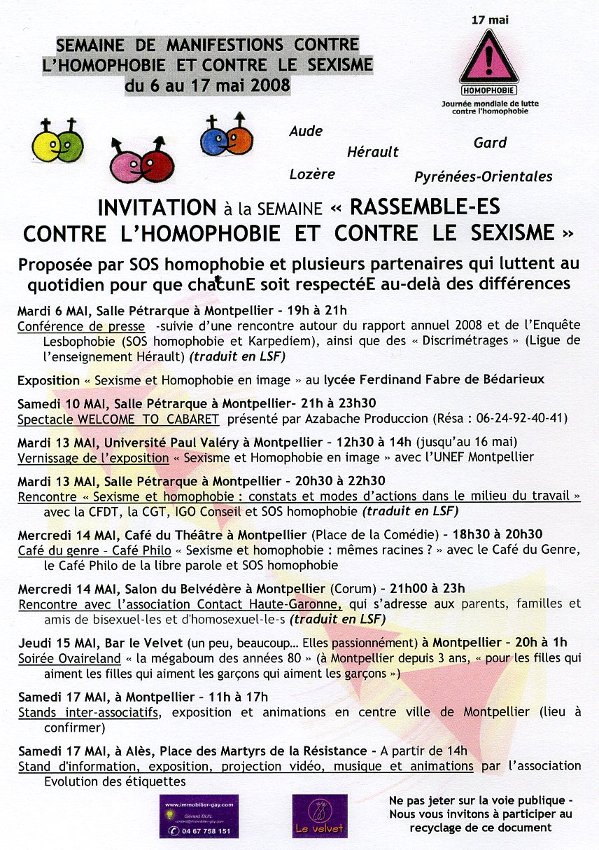 “Depuis six ans déjà, notre association combat l’homophobie sous toutes ses formes, discriminations, rejets ou violences liés à l’orientation sexuelle. Ce faisant, Sos homophobie oeuvre pour la reconnaissance des droits fondamentaux de la personne homosexuelle. Pendant ces années, nous avons souvent eu l’impression de dépenser beaucoup d’énergie pour aboutir à de bien maigres résultats.