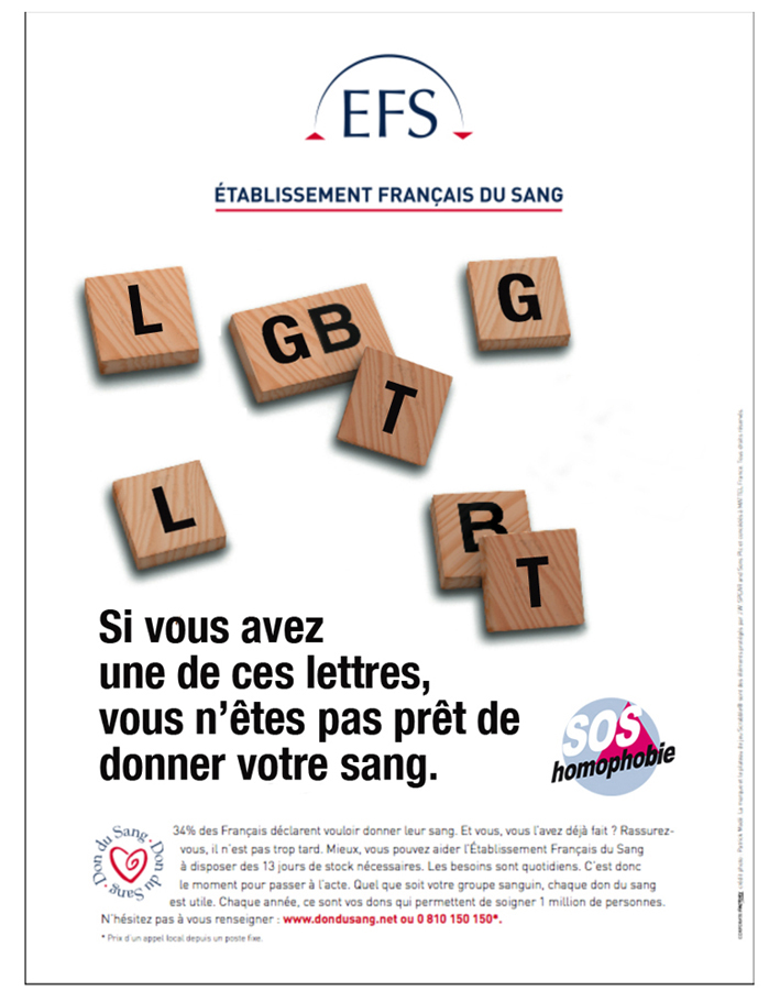 Caricature d’une affiche de l’Établissement Français du Sang par SOS Homophobie, contre la discrimination dans les dons du sang